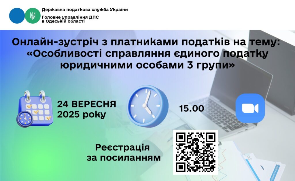 Головне управління ДПС в Одеській області запрошує платників податків регіону долучитися до онлайн-зустрічі на тему: «Особливості справляння єдиного податку юридичними особами 3 групи».