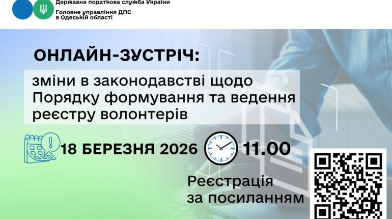 Головне управління ДПС в Одеській області запрошує платників податків регіону долучитися до онлайн-зустрічі, присвяченої змінам до Порядку формування та ведення Реєстру волонтерів. Під час заходу фахівці податкової служби роз’яснять нововведення та дадуть відповіді на запитання учасників. Зустріч відбудеться 18 березня 2026 року об 11:00 у форматі онлайн на платформі Zoom. Спікерами виступлять фахівці управління податкових сервісів […]